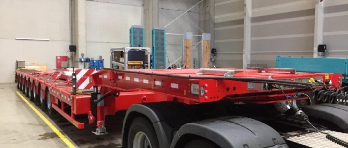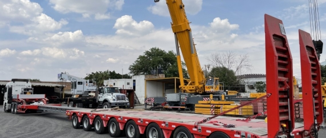 Lowboy extendible de 8 ejes direccionales con cama util de 14 metros y extendible hasta 24 metros con capacidad de carga de 120 toneladas.
